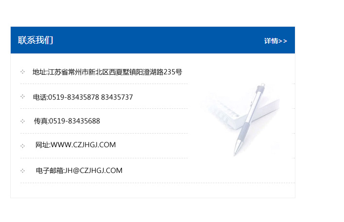 地址:常州市新北區友邦商務大廈1幢16、17層  電話:0519-85101652  傳真:0519-85112595  郵編:213022  網址:www_cz-jiayue_cn.jiuhuayu.com  郵箱:xiajifengaa@163.com